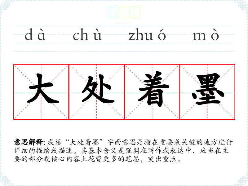 成语“大处着墨”字面意思是指在重要或关键的地方进行详细的描绘或描述。其基本含义是强调在写作或表达中,应当在主要的部分或核心内容上花费更多的笔墨,突出重点。