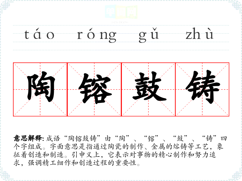 成语“陶镕鼓铸”由“陶”、“镕”、“鼓”、“铸”四个字组成。字面意思是指通过陶瓷的制作、金属的熔铸等工艺,象征着创造和制造。引申义上,它表示对事物的精心制作和努力追求,强调精工细作和创造过程的重要性。