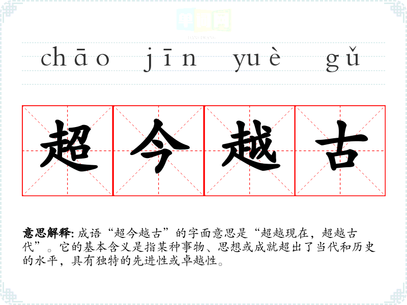 成语“超今越古”的字面意思是“超越现在,超越古代”。它的基本含义是指某种事物、思想或成就超出了当代和历史的水平,具有独特的先进性或卓越性。