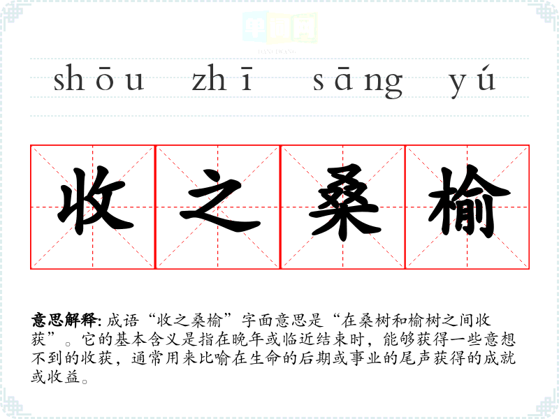 成语“收之桑榆”字面意思是“在桑树和榆树之间收获”。它的基本含义是指在晚年或临近结束时,能够获得一些意想不到的收获,通常用来比喻在生命的后期或事业的尾声获得的成就或收益。