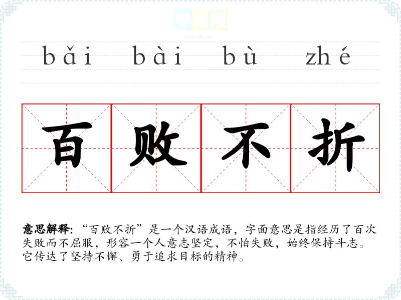 “百败不折”是一个汉语成语,字面意思是指经历了百次失败而不屈服,形容一个人意志坚定,不怕失败,始终保持斗志。它传达了坚持不懈、勇于追求目标的精神。