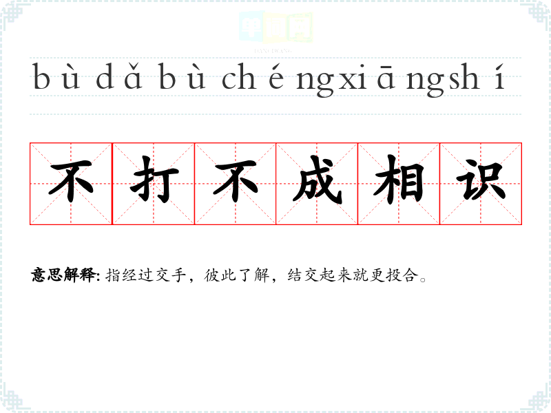 | 不打不相识 | 指经过交手,相互了解,能更好地结交、相处。 |