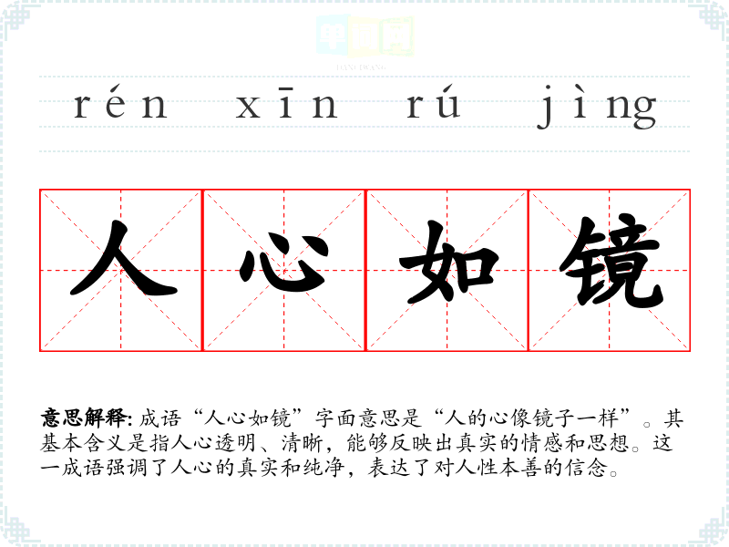 成语“人心如镜”字面意思是“人的心像镜子一样”。其基本含义是指人心透明、清晰,能够反映出真实的情感和思想。这一成语强调了人心的真实和纯净,表达了对人性本善的信念。