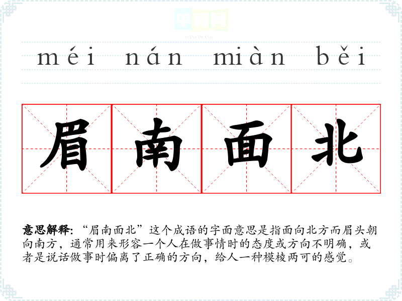 “眉南面北”这个成语的字面意思是指面向北方而眉头朝向南方,通常用来形容一个人在做事情时的态度或方向不明确,或者是说话做事时偏离了正确的方向,给人一种模棱两可的感觉。