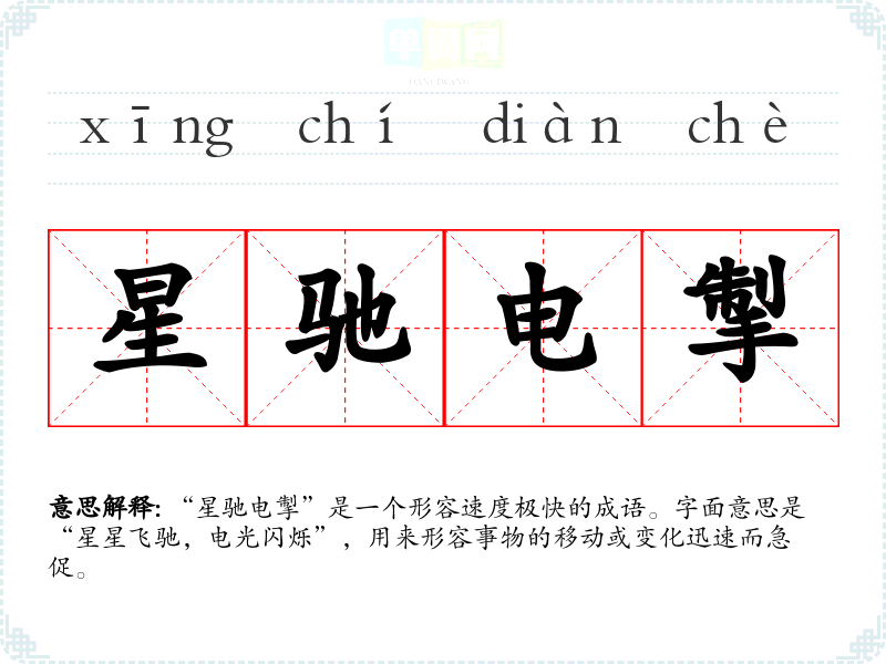 “星驰电掣”是一个形容速度极快的成语。字面意思是“星星飞驰,电光闪烁”,用来形容事物的移动或变化迅速而急促。