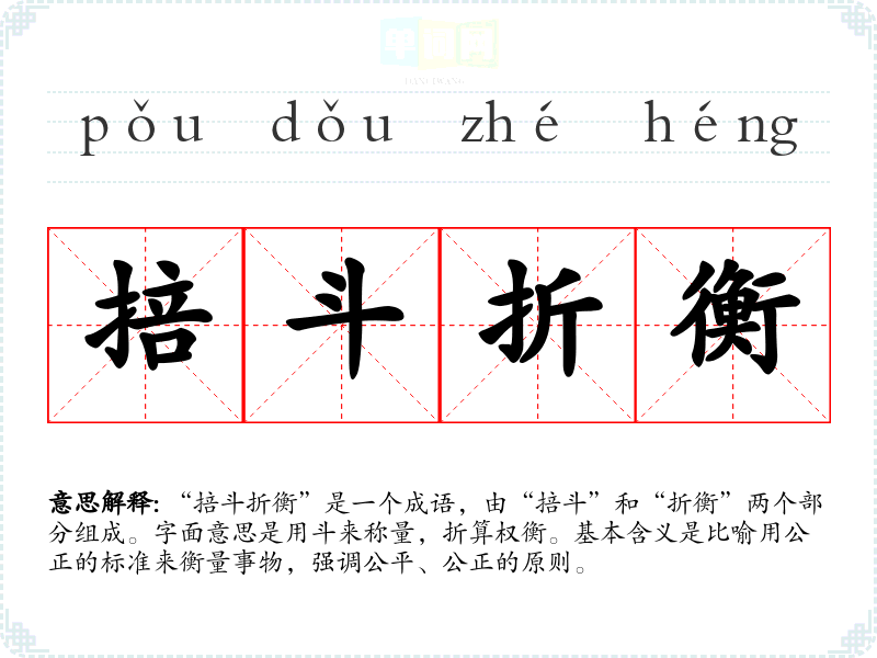 “掊斗折衡”是一个成语,由“掊斗”和“折衡”两个部分组成。字面意思是用斗来称量,折算权衡。基本含义是比喻用公正的标准来衡量事物,强调公平、公正的原则。