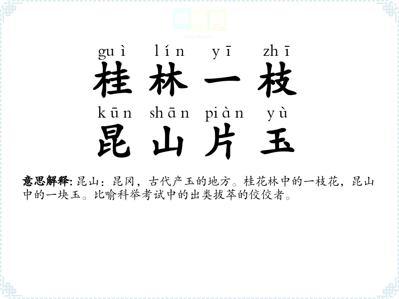 | 桂林一枝,昆山片玉 | 昆山:昆冈,古代产玉的地方。桂花林中的一枝花,昆山中的一块玉。比喻科举考试中的出类拔萃的佼佼者。 |