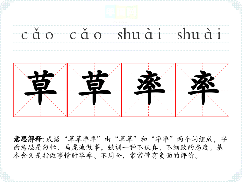 成语“草草率率”由“草草”和“率率”两个词组成,字面意思是匆忙、马虎地做事,强调一种不认真、不细致的态度。基本含义是指做事情时草率、不周全,常常带有负面的评价。