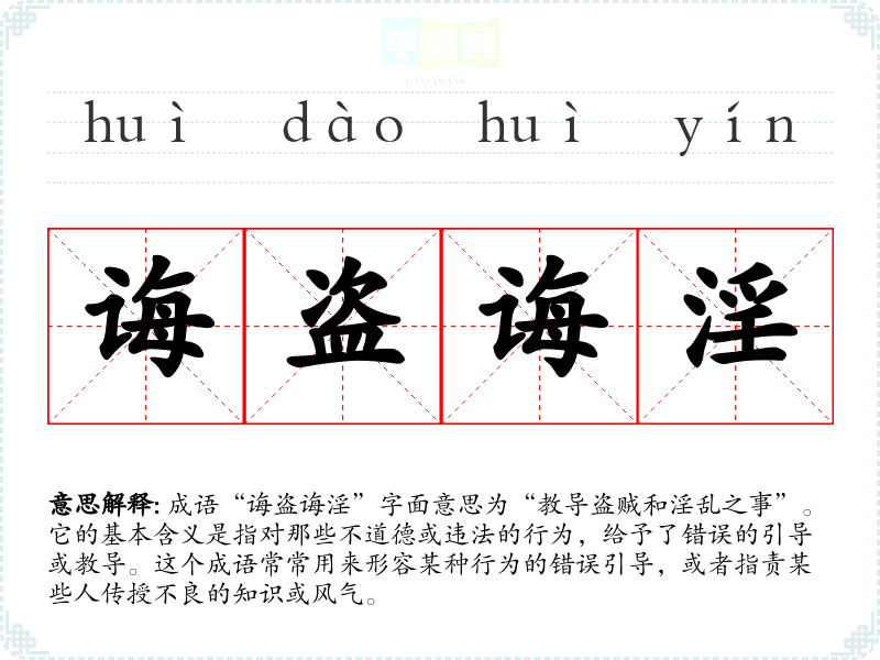 | 诲淫诲盗 | 原意是财物不仔细保管,招致别人来偷盗;女子打扮得十分妖艳,也是引诱别人来调戏。现指引诱人做奸淫盗窃的事。 |
