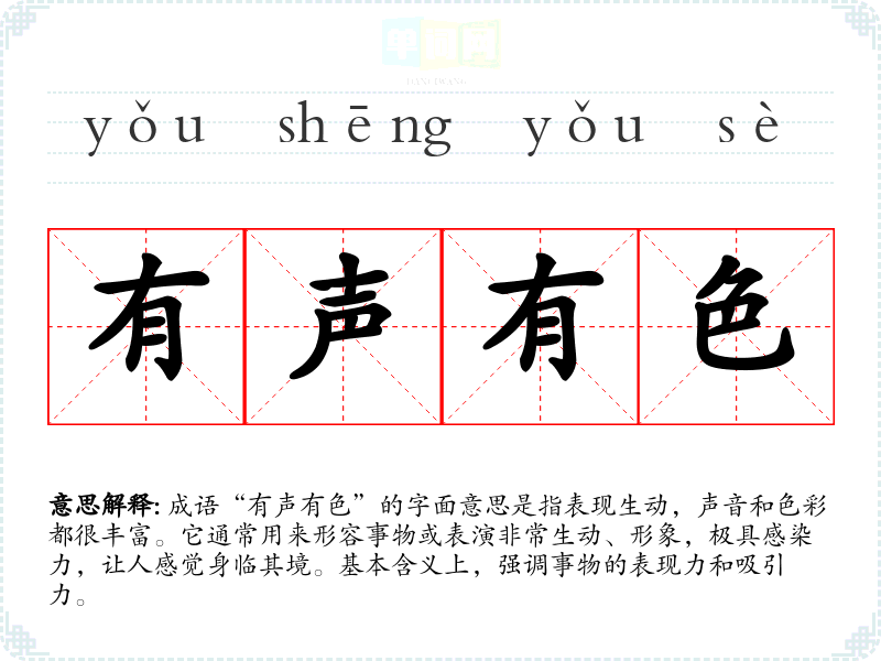 “有声有色”给人一种活力与生动的感受,联想到充满激情的表演、色彩斑斓的画面等。它使人思考如何通过生动的表达来吸引他人,增强与他人的沟通效果。