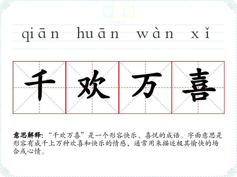 通过对“千欢万喜”的学,我更加理解了它在表达快乐情感中的重要性。在语言学和表达中,能够恰当地使用这种成语,不仅能丰富表达的层次,也能更好地传达情感的细腻变化。