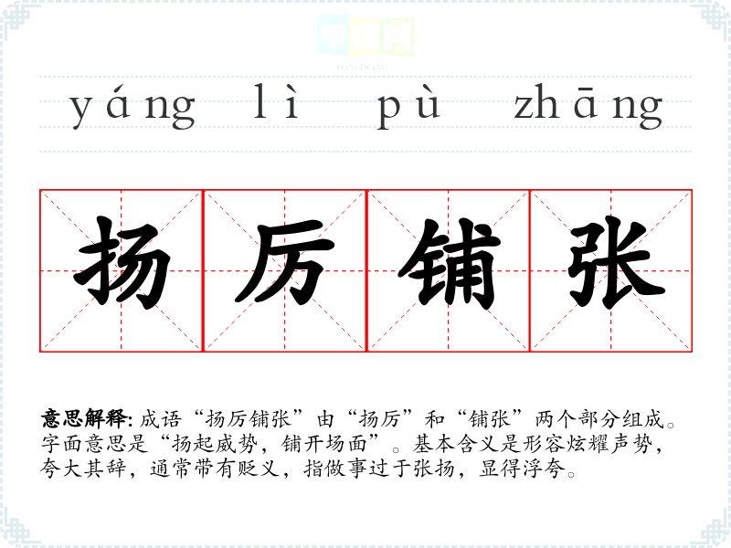 成语“扬厉铺张”由“扬厉”和“铺张”两个部分组成。字面意思是“扬起威势,铺开场面”。基本含义是形容炫耀声势,夸大其辞,通常带有贬义,指做事过于张扬,显得浮夸。