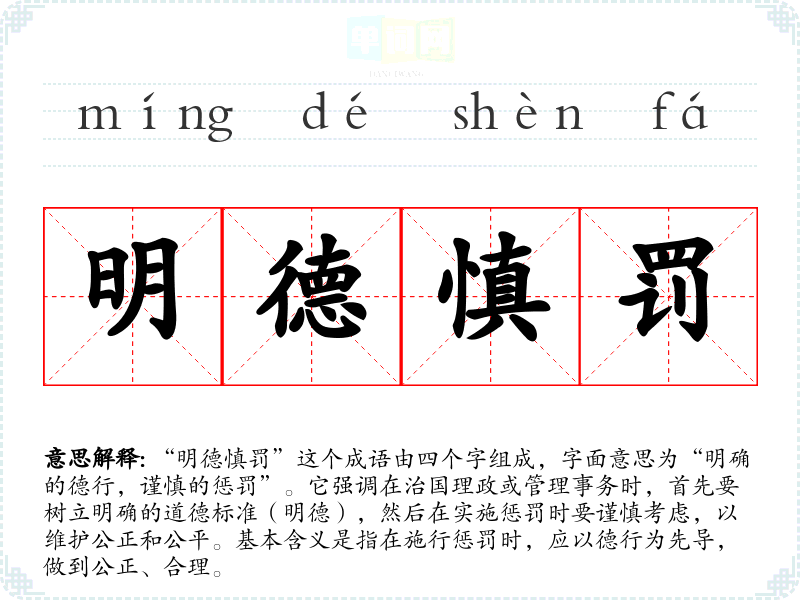 “明德慎罚”这个成语由四个字组成,字面意思为“明确的德行,谨慎的惩罚”。它强调在治国理政或管理事务时,首先要树立明确的道德标准(明德),然后在实施惩罚时要谨慎考虑,以维护公正和公平。基本含义是指在施行惩罚时,应以德行为先导,做到公正、合理。