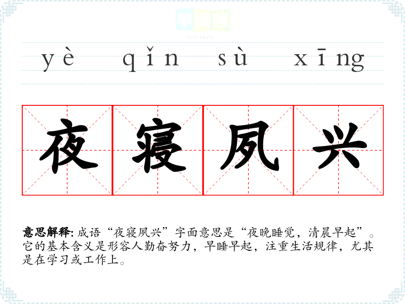 成语“夜寝夙兴”字面意思是“夜晚睡觉,清晨早起”。它的基本含义是形容人勤奋努力,早睡早起,注重生活规律,尤其是在学*或工作上。