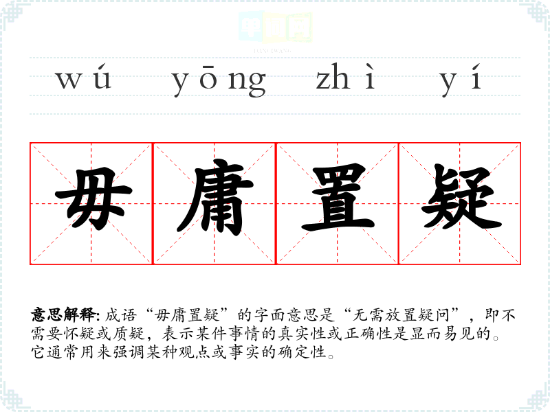 成语“毋庸置疑”的字面意思是“无需放置疑问”,即不需要怀疑或质疑,表示某件事情的真实性或正确性是显而易见的。它通常用来强调某种观点或事实的确定性。