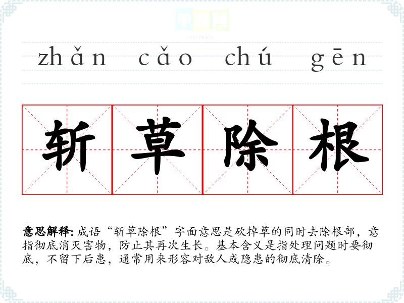 | 削草除根 | 犹斩草除根。指从根本上消除祸患。 |