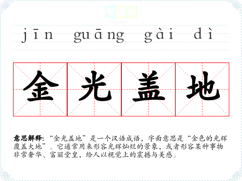 “金光盖地”是一个汉语成语,字面意思是“金色的光辉覆盖大地”。它通常用来形容光辉灿烂的景象,或者形容某种事物非常奢华、富丽堂皇,给人以视觉上的震撼与美感。