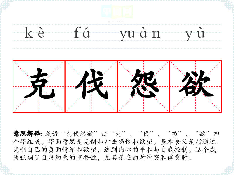 成语“克伐怨欲”由“克”、“伐”、“怨”、“欲”四个字组成。字面意思是克制和打击怨恨和欲望。基本含义是指通过克制自己的负面情绪和欲望,达到内心的平和与自我控制。这个成语强调了自我约束的重要性,尤其是在面对冲突和诱惑时。
