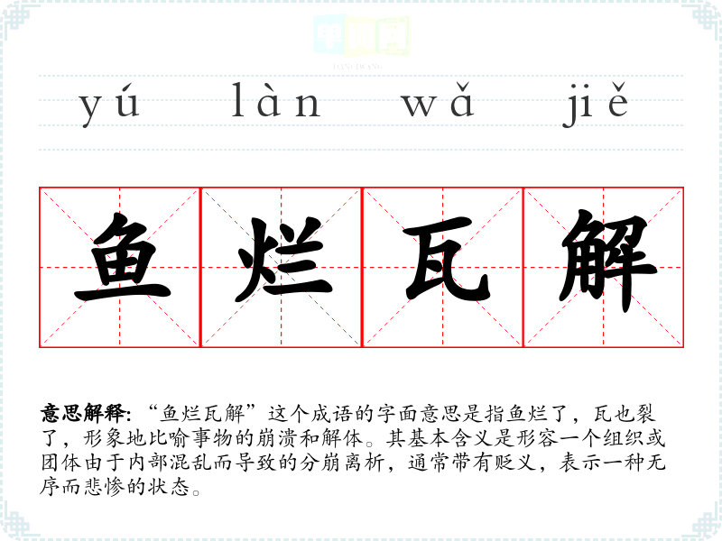 “鱼烂瓦解”这个成语的字面意思是指鱼烂了,瓦也裂了,形象地比喻事物的崩溃和解体。其基本含义是形容一个组织或团体由于内部混乱而导致的分崩离析,通常带有贬义,表示一种无序而悲惨的状态。