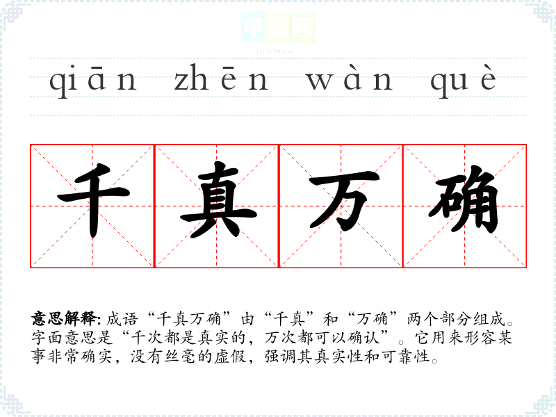 成语“千真万确”由“千真”和“万确”两个部分组成。字面意思是“千次都是真实的,万次都可以确认”。它用来形容某事非常确实,没有丝毫的虚假,强调其真实性和可靠性。
