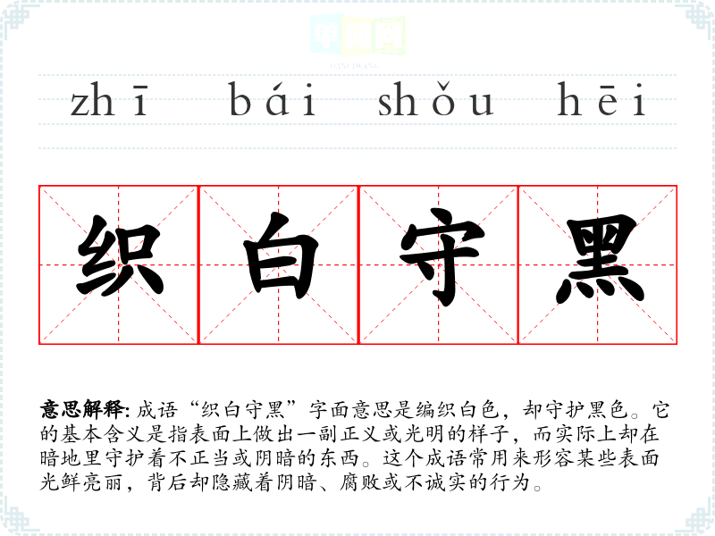 成语“织白守黑”字面意思是编织白色,却守护黑色。它的基本含义是指表面上做出一副正义或光明的样子,而实际上却在暗地里守护着不正当或阴暗的东西。这个成语常用来形容某些表面光鲜亮丽,背后却隐藏着阴暗、腐败或不诚实的行为。