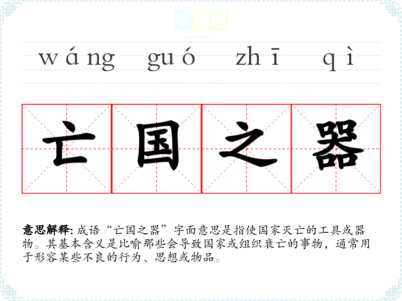 成语“亡国之器”字面意思是指使国家灭亡的工具或器物。其基本含义是比喻那些会导致国家或组织衰亡的事物,通常用于形容某些不良的行为、思想或物品。