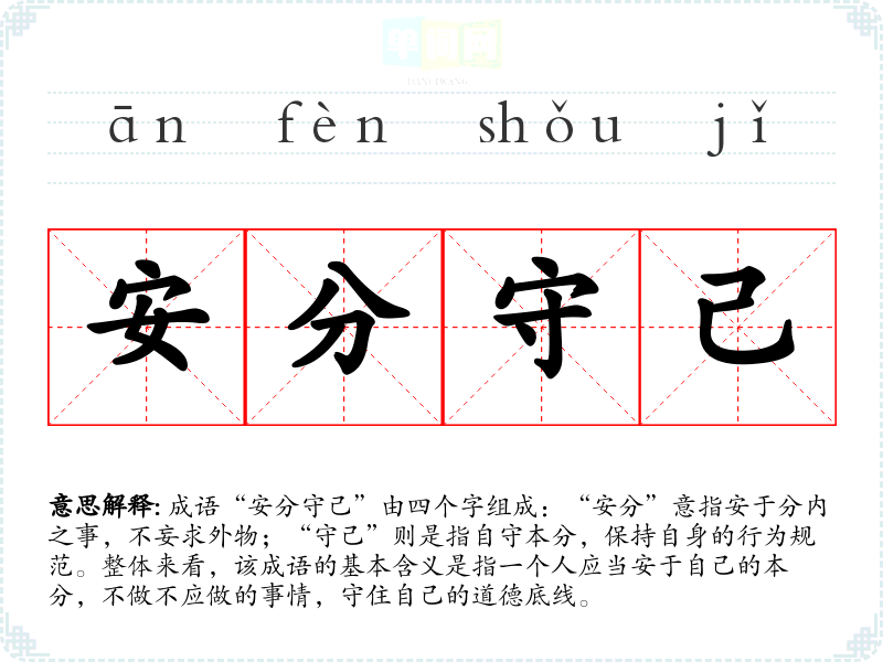 成语“安分守己”由四个字组成:“安分”意指安于分内之事,不妄求外物;“守己”则是指自守本分,保持自身的行为规范。整体来看,该成语的基本含义是指一个人应当安于自己的本分,不做不应做的事情,守住自己的道德底线。