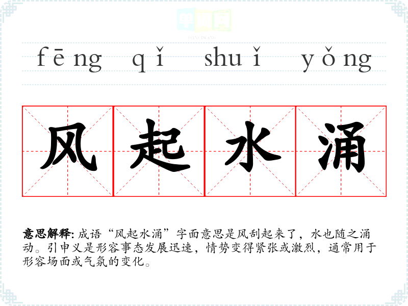 成语“风起水涌”字面意思是风刮起来了,水也随之涌动。引申义是形容事态发展迅速,情势变得紧张或激烈,通常用于形容场面或气氛的变化。