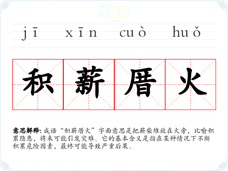 成语“积薪厝火”字面意思是把薪柴堆放在火旁,比喻积累隐患,将来可能引发灾难。它的基本含义是指在某种情况下不断积累危险因素,最终可能导致严重后果。
