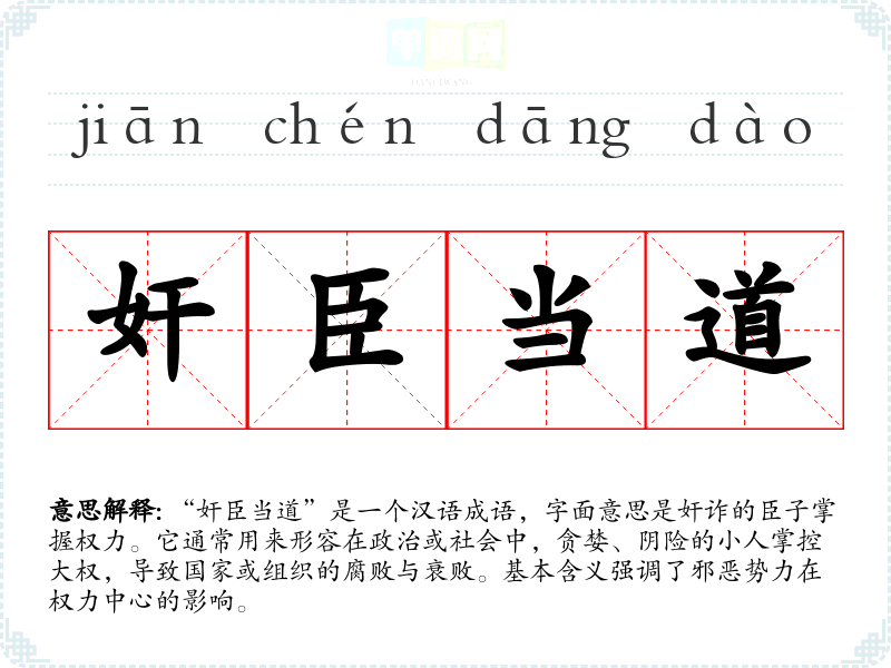 “奸臣当道”是一个汉语成语,字面意思是奸诈的臣子掌握权力。它通常用来形容在政治或社会中,贪婪、阴险的小人掌控大权,导致国家或组织的腐败与衰败。基本含义强调了邪恶势力在权力中心的影响。