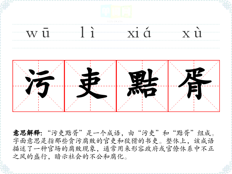 “污吏黠胥”是一个成语,由“污吏”和“黠胥”组成。字面意思是指那些贪污腐败的官吏和狡猾的书吏。整体上,该成语描述了一种官场的腐败现象,通常用来形容政府或官僚体系中不正之风的盛行,暗示社会的不公和腐化。