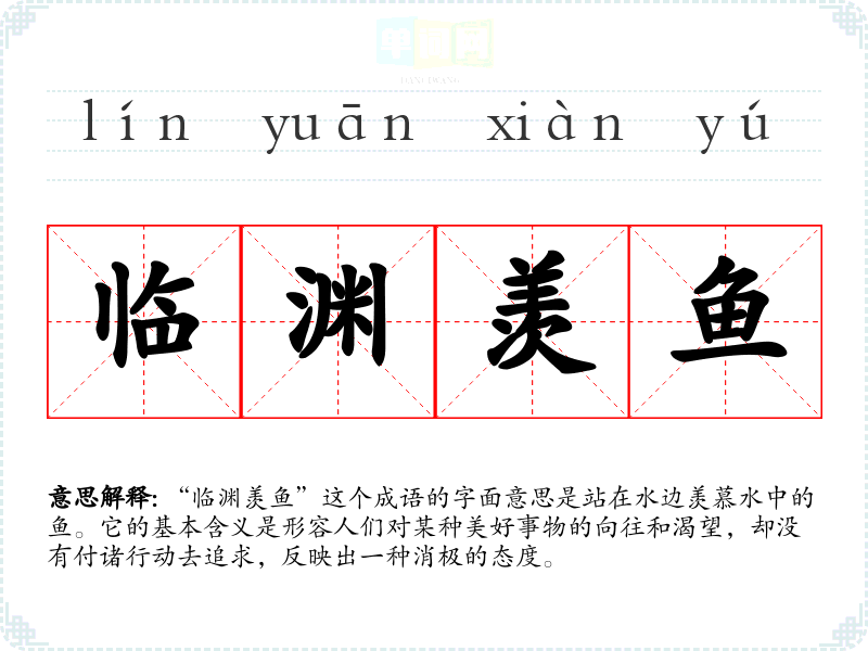 “临渊羡鱼”这个成语的字面意思是站在水边羡慕水中的鱼。它的基本含义是形容人们对某种美好事物的向往和渴望,却没有付诸行动去追求,反映出一种消极的态度。