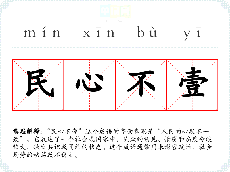 “民心不壹”这个成语的字面意思是“人民的心思不一致”。它表达了一个社会或国家中,民众的意见、情感和态度分歧较大,缺乏共识或团结的状态。这个成语通常用来形容政治、社会局势的动荡或不稳定。