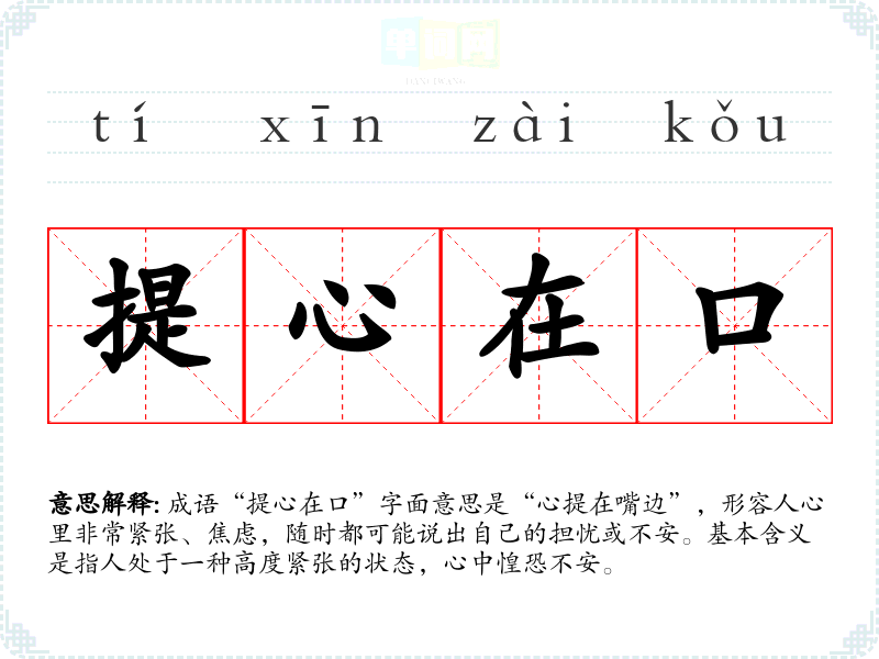 成语“提心在口”字面意思是“心提在嘴边”,形容人心里非常紧张、焦虑,随时都可能说出自己的担忧或不安。基本含义是指人处于一种高度紧张的状态,心中惶恐不安。