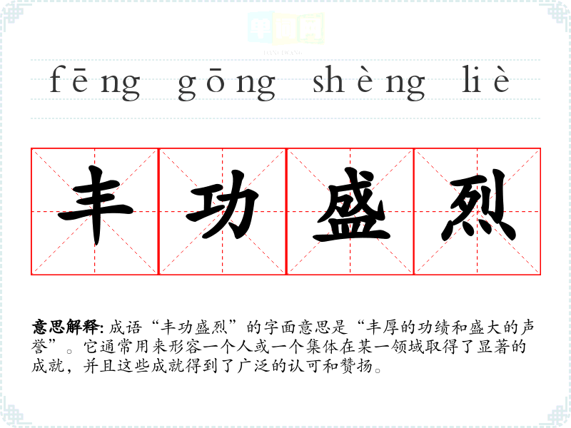 成语“丰功盛烈”的字面意思是“丰厚的功绩和盛大的声誉”。它通常用来形容一个人或一个集体在某一领域取得了显著的成就,并且这些成就得到了广泛的认可和赞扬。