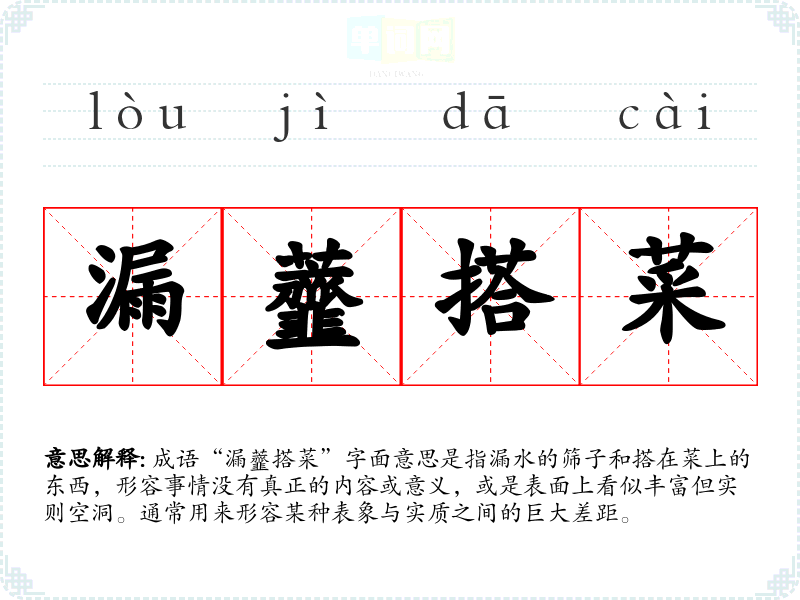 成语“漏虀搭菜”字面意思是指漏水的筛子和搭在菜上的东西,形容事情没有真正的内容或意义,或是表面上看似丰富但实则空洞。通常用来形容某种表象与实质之间的巨大差距。