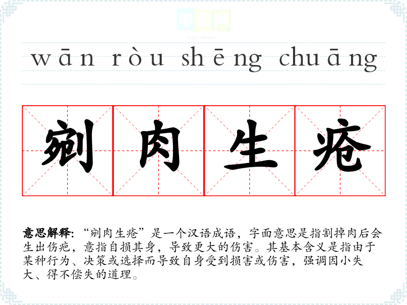 “剜肉生疮”是一个汉语成语,字面意思是指割掉肉后会生出伤疤,意指自损其身,导致更大的伤害。其基本含义是指由于某种行为、决策或选择而导致自身受到损害或伤害,强调因小失大、得不偿失的道理。