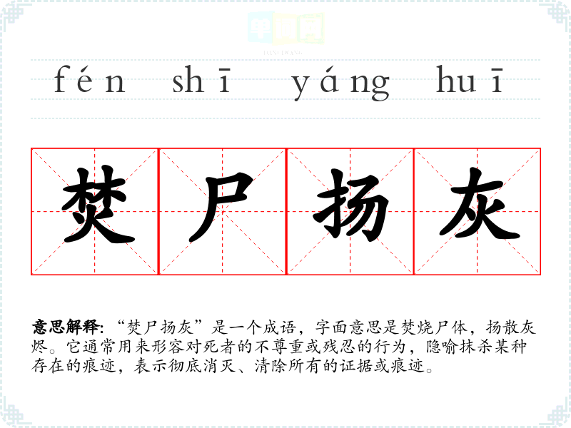 “焚尸扬灰”是一个成语,字面意思是焚烧尸体,扬散灰烬。它通常用来形容对死者的不尊重或残忍的行为,隐喻抹杀某种存在的痕迹,表示彻底消灭、清除所有的证据或痕迹。