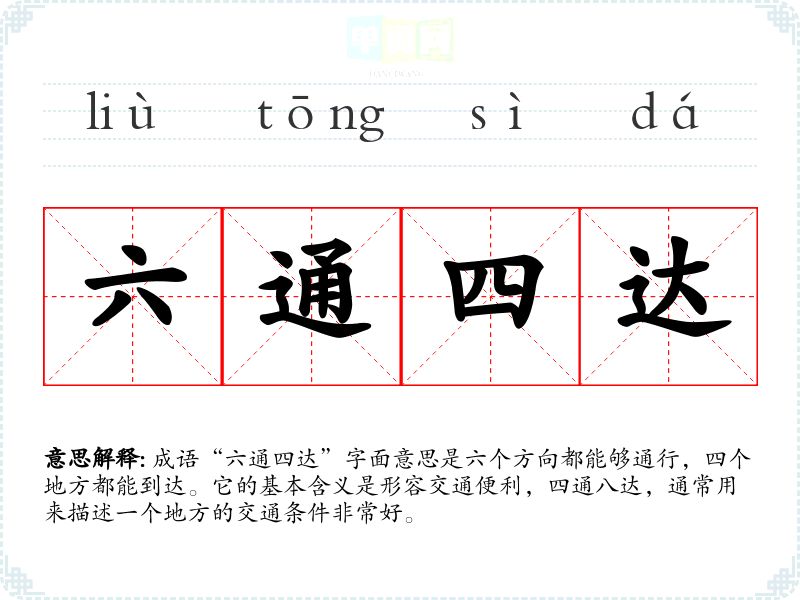 成语“六通四达”字面意思是六个方向都能够通行,四个地方都能到达。它的基本含义是形容交通便利,四通八达,通常用来描述一个地方的交通条件非常好。