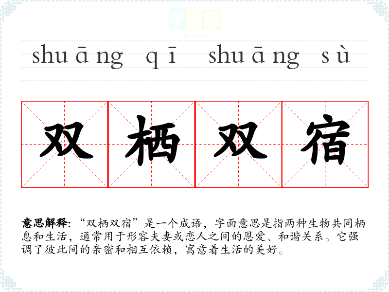 “双栖双宿”是一个成语,字面意思是指两种生物共同栖息和生活,通常用于形容夫妻或恋人之间的恩爱、和谐关系。它强调了彼此间的亲密和相互依赖,寓意着生活的美好。