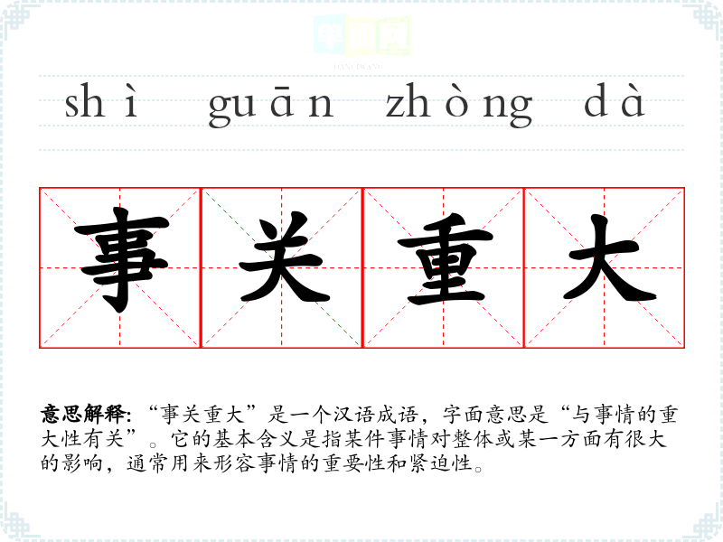 | 事关重大 | 事情关系着大局,非常重要。 |