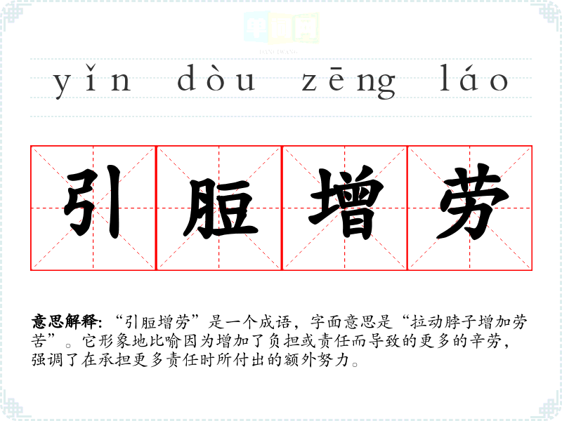 “引脰增劳”是一个成语,字面意思是“拉动脖子增加劳苦”。它形象地比喻因为增加了负担或责任而导致的更多的辛劳,强调了在承担更多责任时所付出的额外努力。