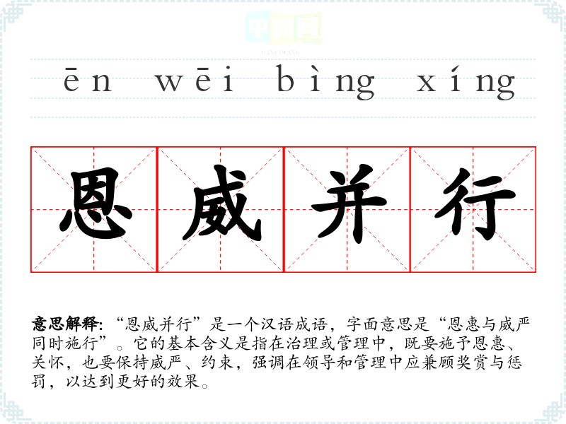 “恩威并行”是一个汉语成语,字面意思是“恩惠与威严同时施行”。它的基本含义是指在治理或管理中,既要施予恩惠、关怀,也要保持威严、约束,强调在领导和管理中应兼顾奖赏与惩罚,以达到更好的效果。