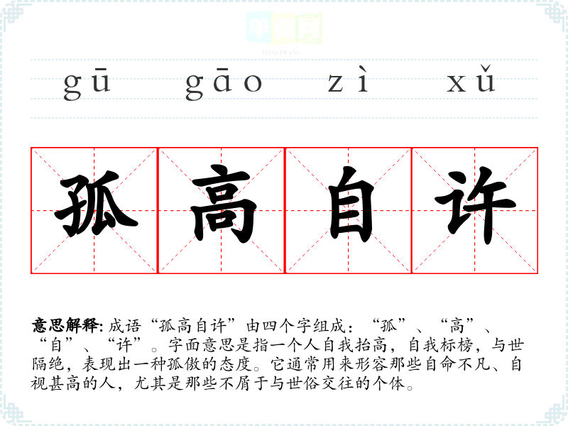 成语“孤高自许”由四个字组成:“孤”、“高”、“自”、“许”。字面意思是指一个人自我抬高,自我标榜,与世隔绝,表现出一种孤傲的态度。它通常用来形容那些自命不凡、自视甚高的人,尤其是那些不屑于与世俗交往的个体。