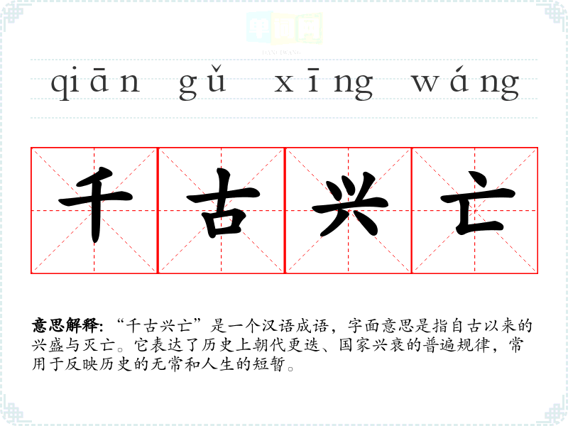 “千古兴亡”是一个汉语成语,字面意思是指自古以来的兴盛与灭亡。它表达了历史上朝代更迭、国家兴衰的普遍规律,常用于反映历史的无常和人生的短暂。