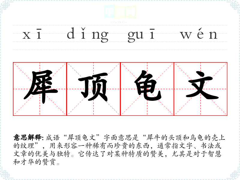 成语“犀顶龟文”字面意思是“犀牛的头顶和乌龟的壳上的纹理”,用来形容一种稀有而珍贵的东西,通常指文字、书法或文章的优美与独特。它传达了对某种特质的赞美,尤其是对于智慧和才华的赞赏。