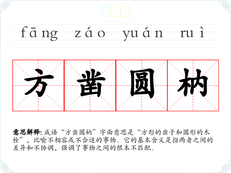 成语“方凿圆枘”字面意思是“方形的凿子和圆形的木栓”,比喻不相容或不合适的事物。它的基本含义是指两者之间的差异和不协调,强调了事物之间的根本不匹配。