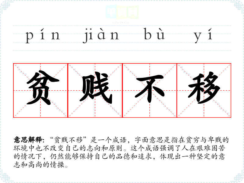 “贫贱不移”是一个成语,字面意思是指在贫穷与卑贱的环境中也不改变自己的志向和原则。这个成语强调了人在艰难困苦的情况下,仍然能够保持自己的品德和追求,体现出一种坚定的意志和高尚的情操。