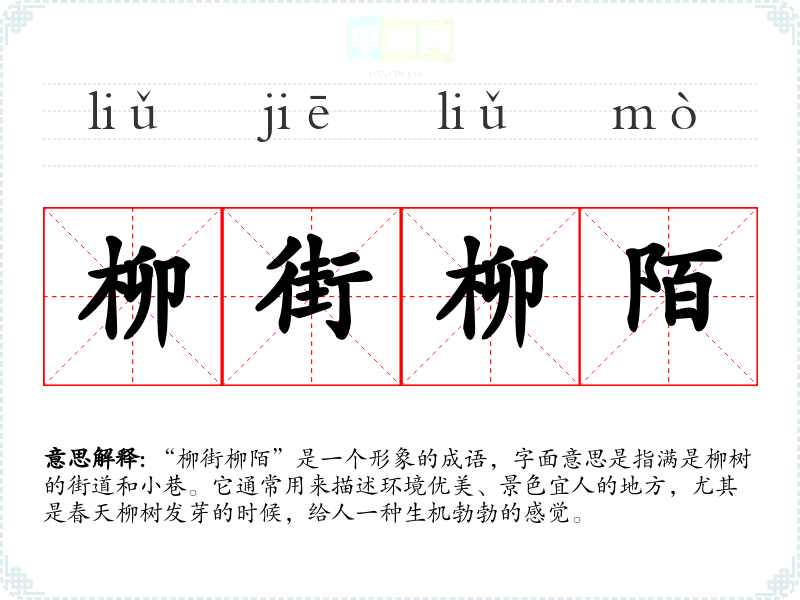 “柳街柳陌”是一个形象的成语,字面意思是指满是柳树的街道和小巷。它通常用来描述环境优美、景色宜人的地方,尤其是春天柳树发芽的时候,给人一种生机勃勃的感觉。