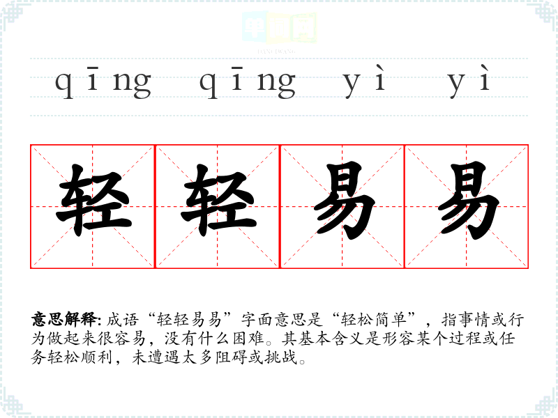 成语“轻轻易易”字面意思是“轻松简单”,指事情或行为做起来很容易,没有什么困难。其基本含义是形容某个过程或任务轻松顺利,未遭遇太多阻碍或挑战。